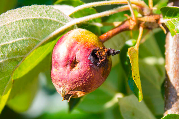 Повреди от болестта се наблюдават от наедряването на плода до неговата консумация. Първоначално върху заразените плодове се развиват дребни кафяви петна, които бързо се разрастват и обхващат целия плод. При висока влажност и умерено висока температура на въздуха върху повредените части на плода се образуват спорообразуващи туфи под форма на концентрично наредени кръгове. Заразените плодове най-често остават в короната и се мумифицират.