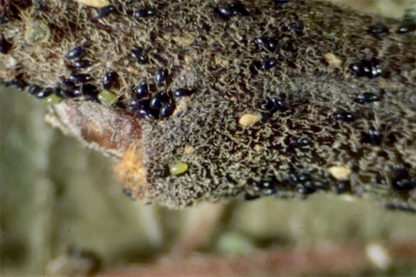 Überwinternde Eier der Roten Spinnmilbe (Panonychus ulmi Koch). Quelle: University of Georgia Plant Pathology Archive (CC BY-NC)